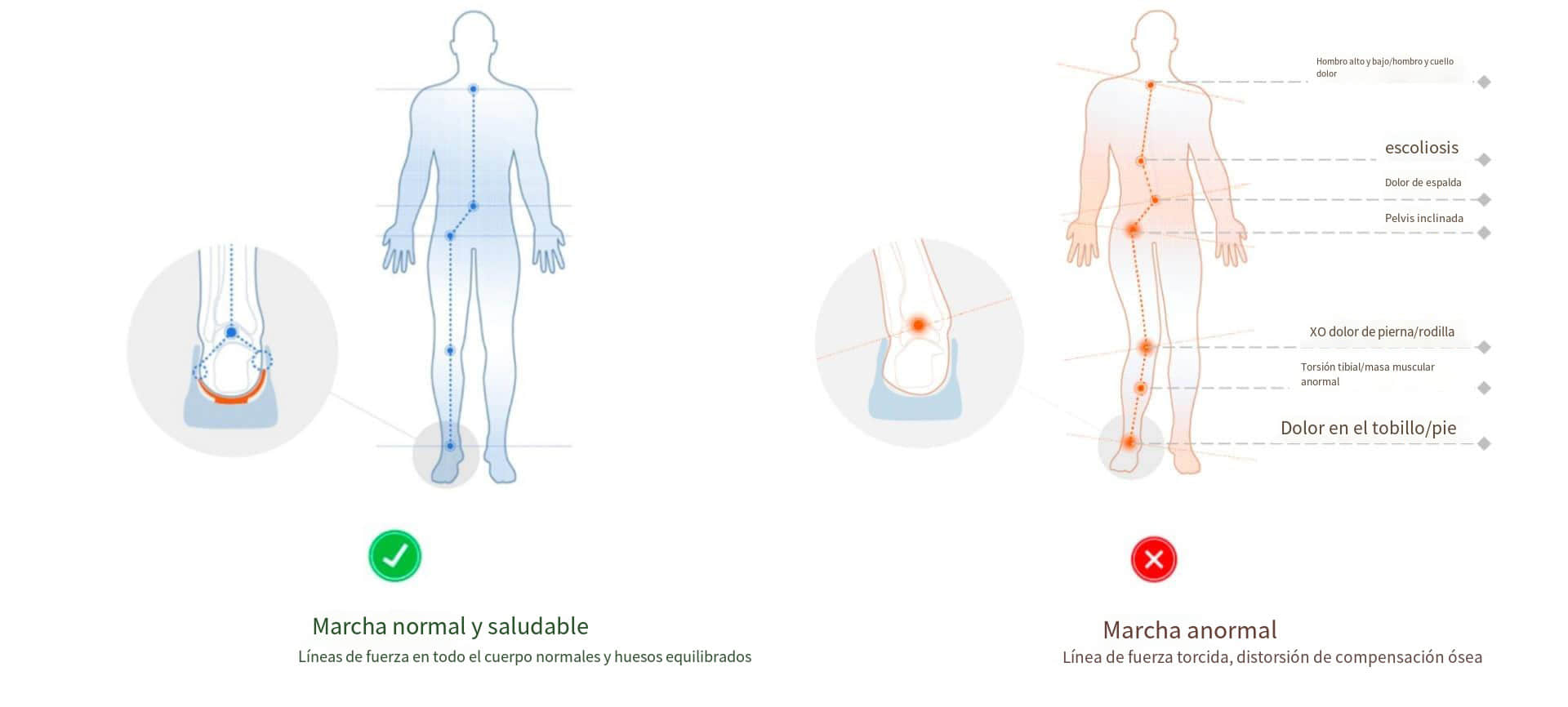 "Si el pie no está correcto, el mecanismo de protección del cuerpo hará que las articulaciones del cuerpo compensen. El tobillo, la rodilla, la cadera, la pelvis y la columna vertebral, desde abajo hacia arriba, se ven involucradas en la compensación.